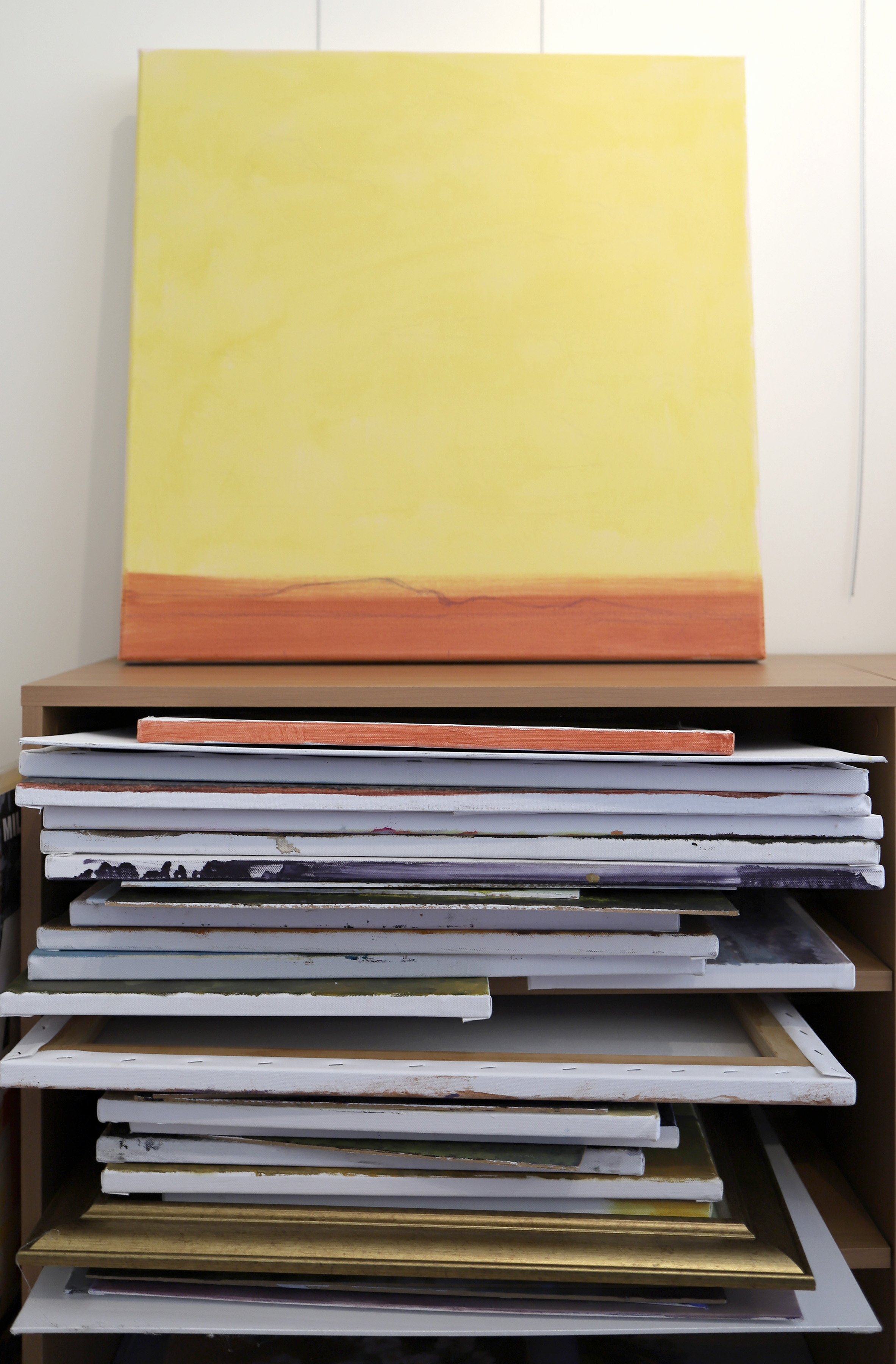 My studio is housed within our walled vegetable garden and orchard. Though relatively compact at 6m x 4m, it's perfect for my needs. It has a south-facing floor-to-ceiling glass door and window that provides consistent natural light. A large workbench ideal for preparing canvases, with storage shelves below is in the centre. An old desk at which I explore ideas and sketch compositional studies butts up against the workbench. Along three walls are storage units and shelves.