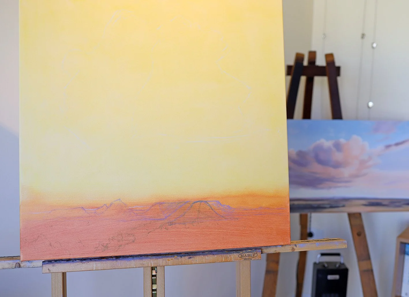 I cover the entire canvas with a mid-tone yellow which I warm towards the horizon and foreground with red ochre. This provides a complementary counterpart to violets in the cloud shadows, and greens in the foreground. I usually have a stock of canvases prepped to this stage ready to go.