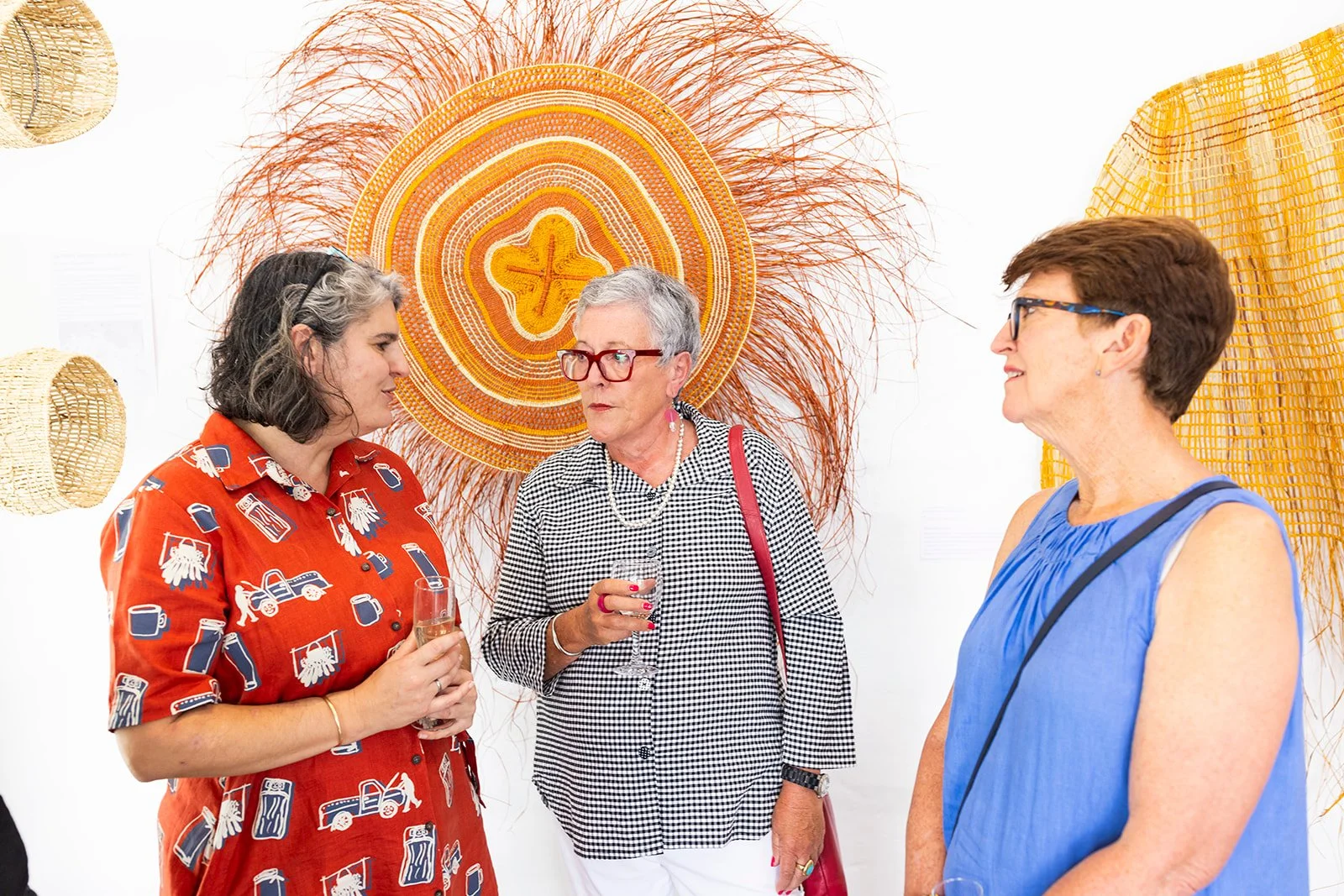 Last weekend we were incredibly privileged to have some wonderful artists from Bula’bula Arts visit us here at The Corner Store Gallery, all the way from central Arnhem Land, Ramingining NT. Director of Bula’bula Arts Mel George accompanied Janice, Kathy and Jeanette to see their exhibition DILTJIPUY, RETJAPUY GA RANGIPUY (it comes from the bush) which is on display until Saturday March 9th. Mel is incredibly knowledgeable about the Yulnu culture and arts practices and we were also lucky enough to see a weaving demonstration on the Sunday morning.