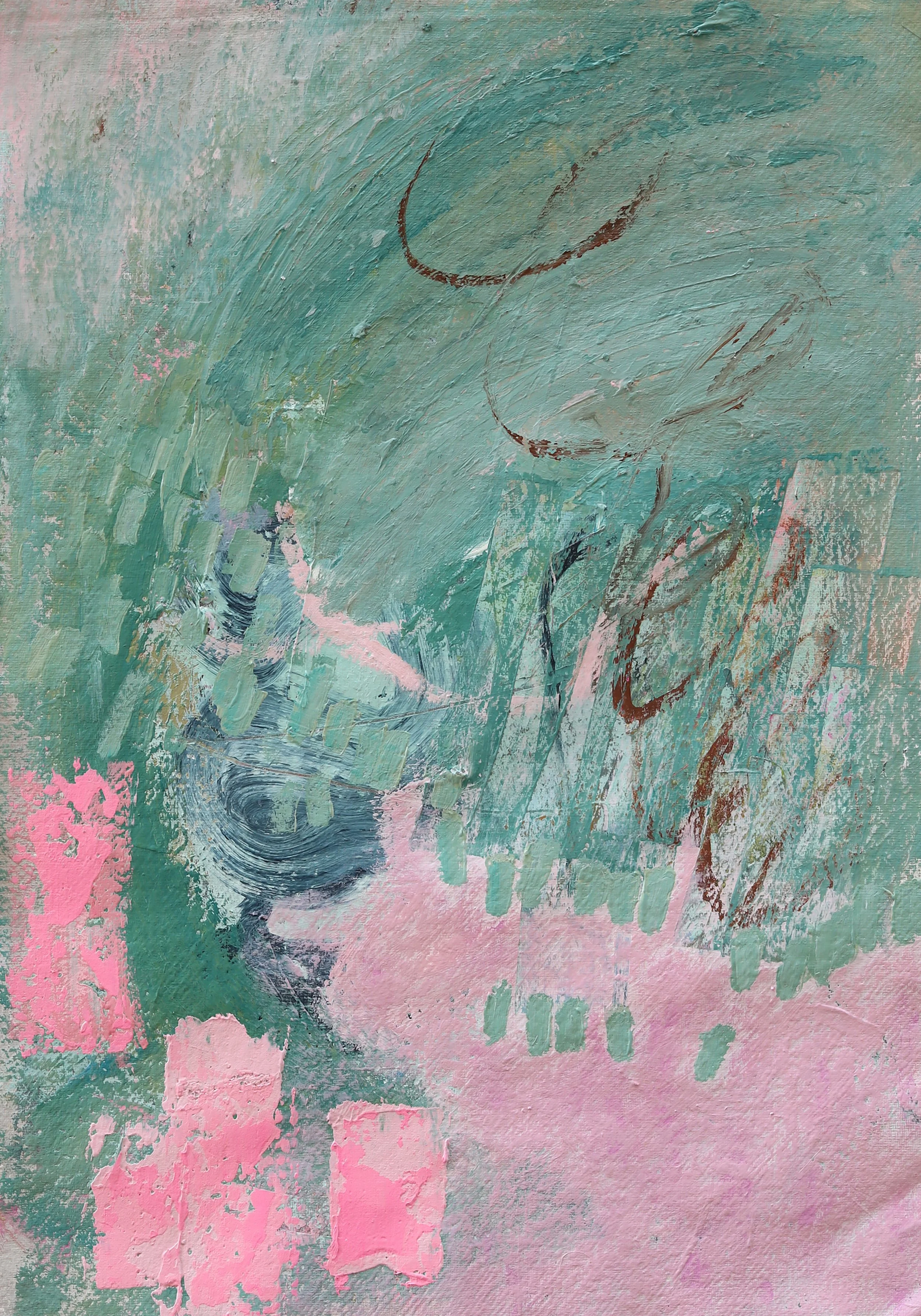 She works with brushes, palette knives, rollers, and other unconventional tools to build textures, patterns, and marks across the surface. Palettes often return to soft pinks, muted greens, and earthy browns, yet are interrupted by unexpected tones - deep blues, sudden warmths - that capture the unpredictability of memory and experience. These choices are not simply aesthetic but emotional, a record of moments felt as much as seen.