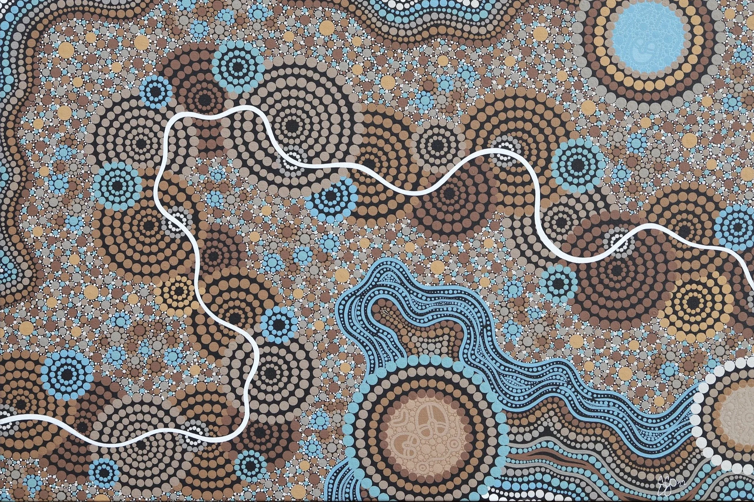 Sandon Gibbs-O'Neill is a proud Nhunggabarra artist who lives on Wiradjuri Country in Orange. Sandons artwork explores the stories he has of his culture and the natural landscape surrounding him. His artwork is mainly acrylic on canvas and he hopes to educate, continue to learn about his culture and challenge stereotypes through creating art. Through his artworks Sandonuses intricate detail, colour and symbols inspired by the designs and stories passed down from the generations before him. His works encourage people to consider the knowledge, stories and history held within the land itself. In putting his stories onto canvas, Sandonhopes people are further driven to consider the rich knowledge and culture of the First Nations people of this land and how it impacts all of society.